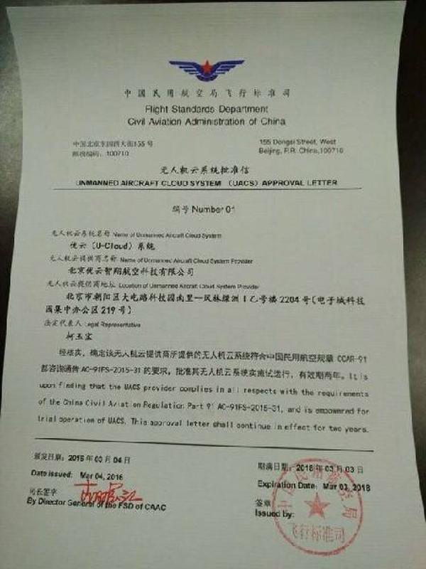 2016年3月4日AOPA(中国航空器拥有者及驾驶员协会)执行秘书长柯玉宝向环球无人机频道透露:无人机云系统(U-Cloud)已经得到中国民用航空局飞行标准司的批文。批准其试运行两年,批文有效期为2016年3月4日至2018年3月3日。