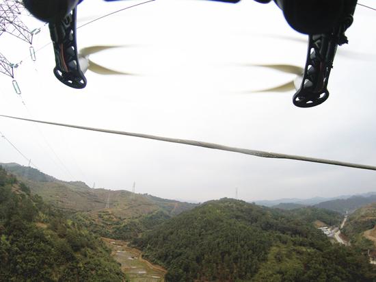 本次无人机巡视是梧州供电局首次采用六旋翼无人机巡视高压输电线路,这也标志着梧州供电局输电线路无人机巡视作业正式启动。在现场我们看到110千伏万都向Ⅰ、Ⅱ线#B3塔高压输电线上空,一个通体黑色的六旋翼无人机往复飞行,还不时停下“盯着”线路仔细查看。