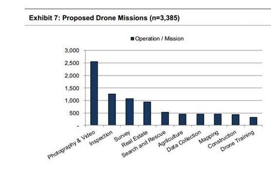 在美国,非娱乐型无人机的运营商想要进行无人机作业,必须获得美国联邦航空管理局(FAA)基于第333节规定授予的豁免权。截止到2016年2月12日,共有3385项申请获得了豁免权,大部分申请主要是针对航空摄影,也有少数针对农业、飞手培训等领域。下图详细列出了3385项申请的具体分配情况。