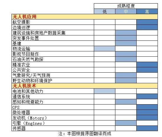 报告首先介绍了无人机应用与技术的成熟程度。最成熟的无人机应用有:航空摄影、边境巡逻、精准农业以及公共安全维护;最成熟的无人机技术有:通信系统、GPS、微处理器、发动机和传感器。