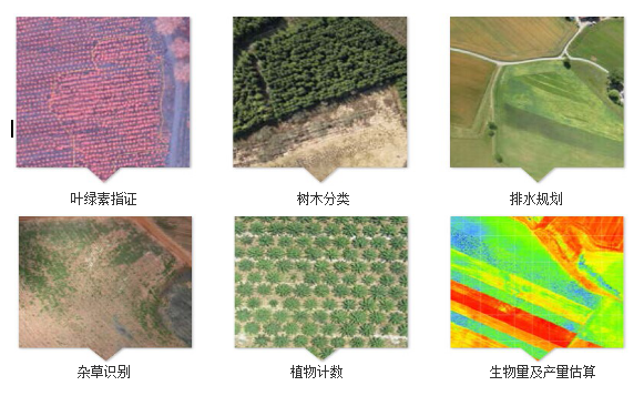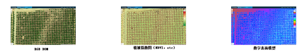 经过DT标配软件(PIX4D)的处理,在软件里,用户可以根据自己的需要来定义和编辑植被指数计算公式,从而生成相应的指数图。由于DT无人机搭载五通道相机能够同时获取可见光波段还有多光谱波段,所以同时可以生成以下带有地理标记的地图。
