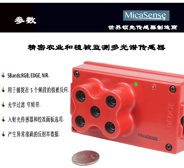 MicaSense RedEdgeTM是一种先进的多光谱相机,它可以为农业远程提供精确的波段数据。同时捕获五个离散光谱波段,每一个通道都有完整的成像仪窄带光学过滤器,全球快门设计免于扭曲的结果,带有单SD卡存储所有图像,为精确校准,可重复的测量。入射光传感器和校准面板选项使飞机不受光线限制,就可以获取高精度的影像。北京天力发集团认为,DT系列无人机+五通道传感器是农业遥感革命性的解决方案,不必等待的卫星传递或支付高成本的有人驾驶飞机飞行。图像扫描率可以达到几公分。农民或者是农业专家频繁数据获取生成RGB地图或者是植被指数地图用来分析作物的健康和其他应用。