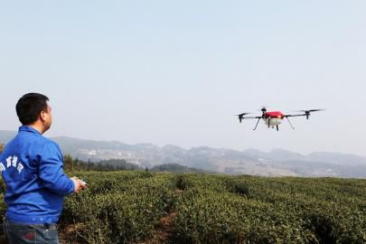 笔者在现场看到,在飞防员的遥控下,无人机不仅能高低起飞,也能360度回转,轻巧如燕。机身中的农药液体变成雾状均匀地喷洒在茶树上,短短十几分钟,数十亩茶山施药任务就完成了。