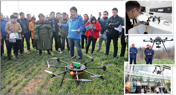 (左图)一位技术人员正在安徽省淮北市向农民展示如何在农业生产中使用无人机。(右上图)一个外国人正在给大疆创新科技有限公司(DJI)生产的飞机拍摄照片。(中间)安徽省一位电力技术员正在操控无人机监测当地220伏的高架电缆。(最下图)位于广东省深圳市的大疆创新科技有限公司(DJI)总部。
