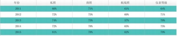驾驶员理论考试历年考试类型通过率对比,私照通过率在2015年有很大的提升,达到81%。