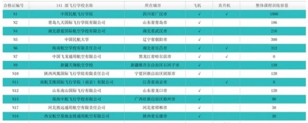 境内141部飞行学校航空器类别和整体训练容量统计表,中国民航飞行学院位列第一位。