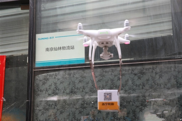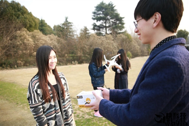 今天,苏宁尝试了一种高大上的送货方式——无人机。上午11点许,“飞行员”驾驶大疆精灵4载着三星Galaxy S7 Edge出发,11:50到达目的地点——南京师范大学仙林校区情人坡。