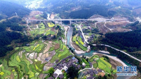 这是3月18日航拍的贵广高铁贵州省榕江境内沿途风光。春暖花开,贵州高原山青水秀,纵横的稻田、古色古香的民族...