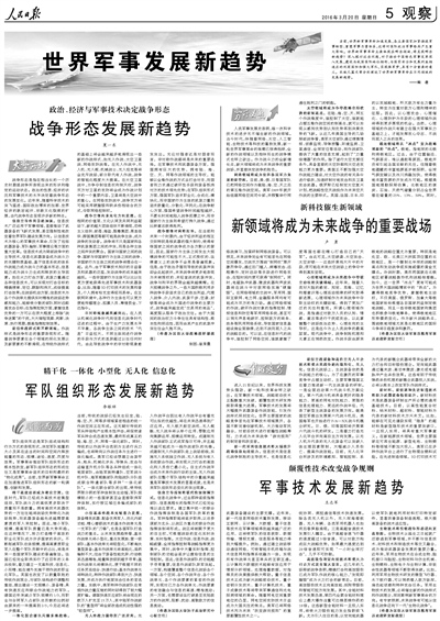 当前,世界新军事革命加速发展,各主要国家加紧推进军事转型、重塑军事力量体系,这将对国际政治军事格局产生重大影响。世界新军事革命主要体现在哪些领域、将呈现哪些新趋势?深入探讨这些问题,对于推动中国特色军事变革深入发展,建设与我国国际地位相称、与国家安全和发展利益相适应的巩固国防和强大军队,实现强军梦,具有十分重要的意义。本版几篇文章分别阐述了世界新军事革命在不同领域的发展新趋势。