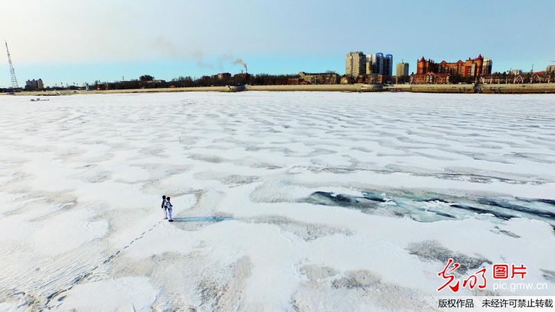 当日,笔者航拍"黑河好八连"巡逻组官兵冒着零下近10度严寒气温在中俄边防线界江冰面上巡逻、站岗,无人机在近200米高空俯瞰冰面犹如月球表面魔幻、壮美,哨兵穿着白色伪装衣行走在冰面上,如同宇航员在月球行走。
