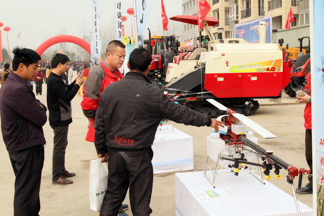 植保无人机吸引不少有意购机客户的驻足,现场负责人常青松表示该款飞机最多可负载17公斤农药,实行低空