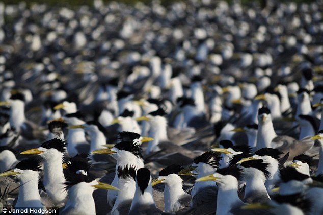 研究人员使用一架八爪直升机拍摄凤头燕鸥在澳大利亚西海岸的阿什摩尔礁上的筑巢地。(叶子)