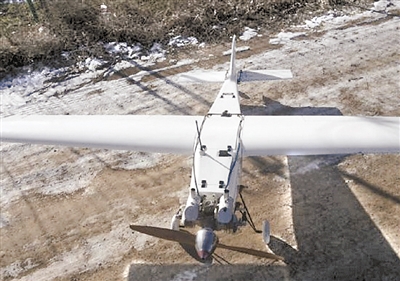一架白色固定翼无人机在环境监测人员操作下迅速升空,机长1.8米、翼展2.6米的飞机,在人们视野中慢慢变小。