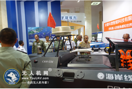 (图摄于2015年中国国际应急救灾装备技术展览会现场,参展展品为安徽科微智能科技有限公司最新研发生产的C400型智能无人船—水上多功能机器人,该展品赢得了很多专业人士的关注与驻足,其中各国使馆武官认真听取了由叶总做出的产品介绍,并纷纷拍照留念。)