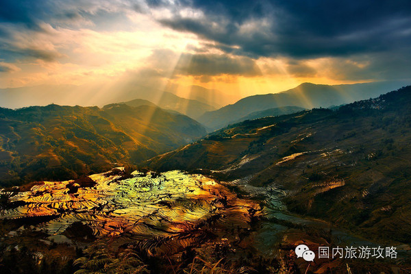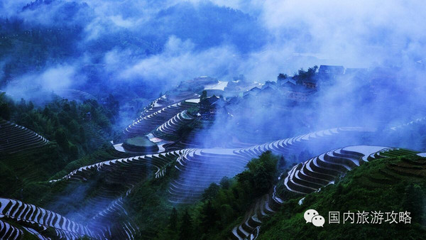 推荐理由:这是往往被我们忽视的一个景色,却往往在摄影 师的眼中成为一幅幅美丽的油墨画作。梯田,农民劳作的结果,在初春,特别是南方 的初春,辛勤的农民们已经在田间地头播撒下绿色的禾苗,整片梯田开始焕发生机,在晨雾朦胧之际,那种美,绿色、黄色、红色、蓝色,大片大片的色块,被雾气折射,像一道人间的彩虹,既朦胧又夺目。2013年(癸巳年)6月22日在第37届世界遗产大会上元阳哈尼梯田 被成功列入世界遗产名录,成为我国第45处世界遗产,使中国超越西班牙 成第二大世界遗产国,仅次于意大利 。