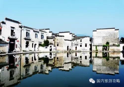宏村,整个村落“牛”形结构布局,牛肠———水圳引西溪河入水口,经九曲十弯流经全村,最后注入南湖 。湖成大弓形,湖岸古树参天,垂柳婀娜,湖面绿荷摇曳,鸭群戏水,另有一番景致。整个湖面倒影浮光,水天一色,远峰近宅,尽落湖中,加之树荫水深和日光的相互作用,明暗协调,动静相宜,显得幽深、雅静、清新、明丽。