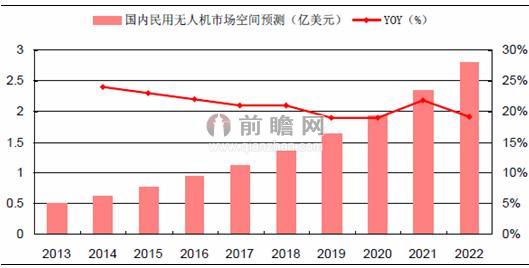 根据分析,未来十年(2013-2022年),我国民用无人机需求总额将由2013年0.5亿美元增至2022年2.8亿美元,需求总额将达到14亿美元,约占十年无人机需求总额的10.4%,十年复合增长21%。