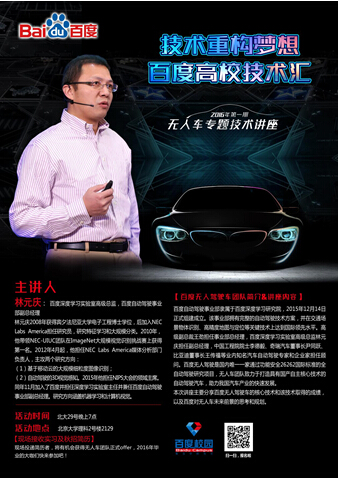 此次百度无人驾驶车团队走进国内名校——北京大学,举办“无人车专题技术讲座”,主要分享百度无人驾驶车的技术和该技术取得的成绩以及百度对无人车未来前景的思考和计划,让名校尖子生更加直接的了解到此项技术并且可以更加直观的了解到无人驾驶车的团队。本团队汇聚人工智能领域的世界级大牛。作为本次讲座的主讲人:林元庆,是计算机视觉、机器学习等领域知名科学家,百度深度学习研究室高级总监、百度自动驾驶事业部副经理。