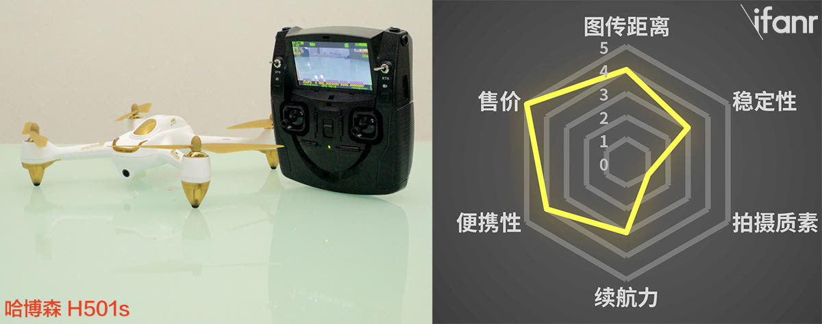 H501s:哈博森 (Hubsan) 的这台无人机机身虽小,但五脏俱存:比 Bebop 2 身躯更细小的它 (250mm 轴距),里面仍然拥有 GPS 和气压计等高阶无人机配备。可是,它需要使用传统遥控器,所以仍不如 Bebop 2 的便携,但也由于使用传统遥控器,让它比 Bebop 2 飞得更高更远。它的最大缺点是没有任何物理或电子云台,使它拍的视频质素惨不忍睹。虽然如此,藉着轻巧性的身躯,和官方天猫店 1499 元的低廉售价, 使它成为目前最佳的入门无人机。