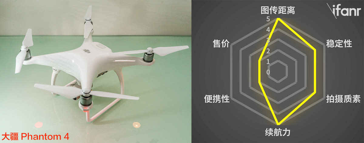 Phantom 4:刚推出的它拥有目前无人机界别最强的 5km 图传距离,也有目前无人机界别唯一的双目跟随、双目避障功能,加上它拥有优秀的 4k 拍摄相机和同级最长的续航时间,使它成为 目前平均能力值最高的无人机。尽管它的最大弱点是较高昂的售价(官方定价:8999 元)和相对笨重的身型,但仍然无阻它成为目前最受欢迎的无人机。