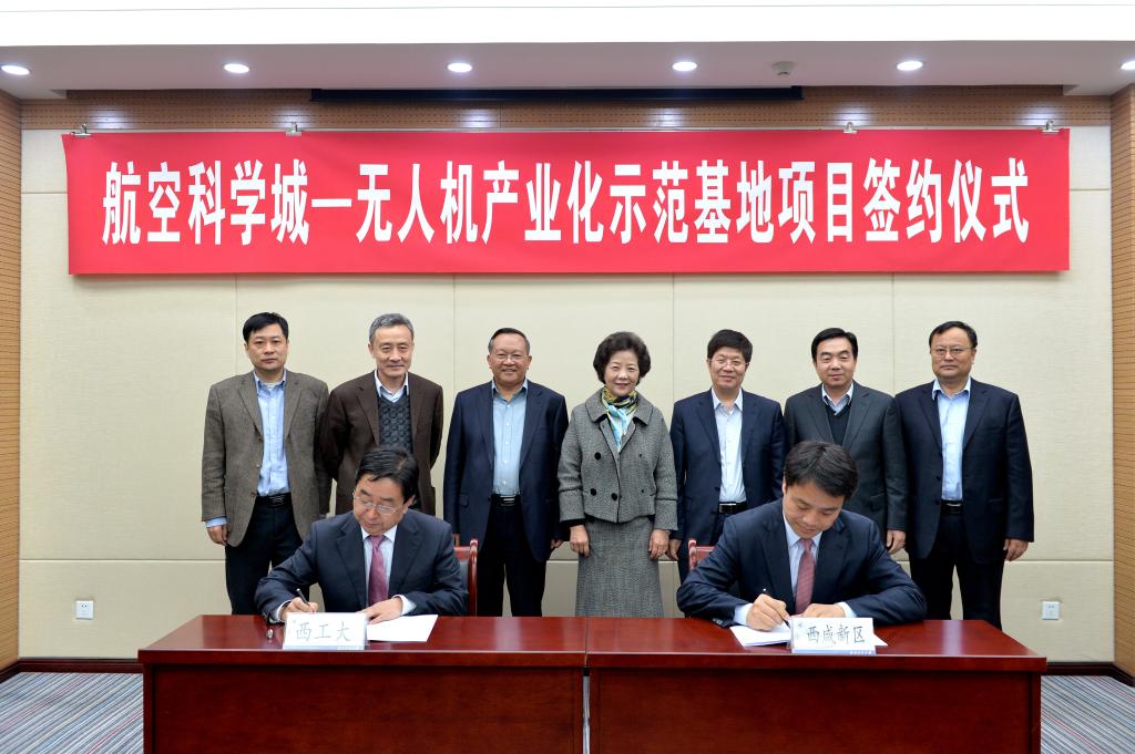 3月30日上午,“航空科学城——无人机产业化示范基地项目”启动暨签约仪式,在学校友谊校区举行。西北工业大学与陕西西咸新区签署合作协议,通过强强联合,加速民用无人机产业化基地项目建设。这也标志着,陕西未来将全力打造中国最大的高端中小型无人机产业化基地。