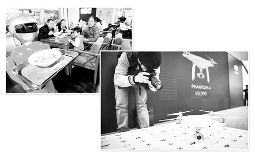右图 大疆创新在深圳举行精灵Phantom4体验会,这款无人机将“机器视觉”与“机器学习”付诸实际使用,具有智能跟随、障碍感知、指点飞行等全新功能。 新华社记者 毛思倩摄
