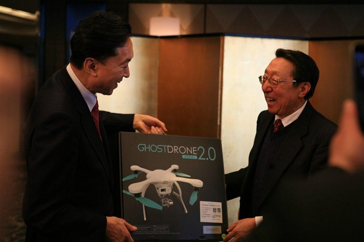 陈健大使(右)亲手赠送鸠山由纪夫亿航GHOSTDRONE 2.0智能无人机