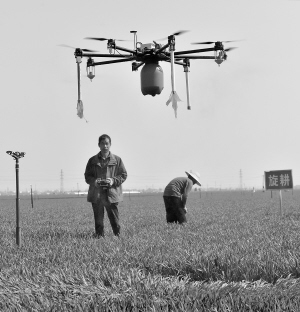 4月7日,在赵县素敏粮食种植专业合作社,农技人员操作无人植保机对小麦进行病虫害防治作业。目前正值防治小麦病虫害的关键时期...
