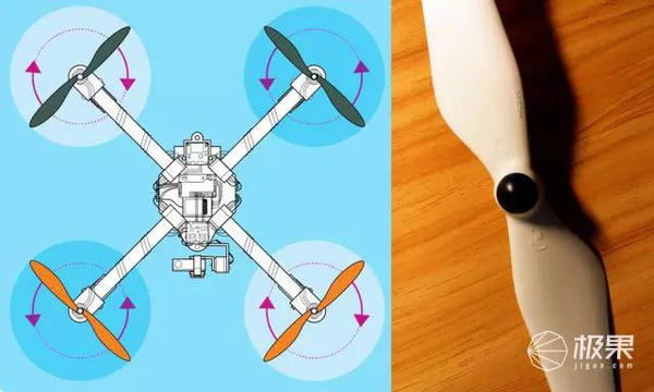 四支9寸螺旋桨分别为一对银色尖头旋桨和黑色尖头旋桨,交叉旋紧在电机主轴上。旋紧和松卸操作螺旋桨上都有标识提示。正反自紧桨无需工具便轻松装卸,由于浆叶的受力情况,会在电机转动时越旋越紧,可确保旋桨在四轴飞行时不易脱落。但在起飞之前还是要手动旋紧才更可靠,下图示意正反桨原理。