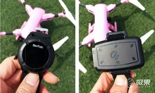 智能手表能实现对飞机的遥控,显示飞机状态参数,操纵飞行姿态,调整相机视角。独立的跟踪模块可绑束在手臂上,侧面为开关按钮和充电接口。