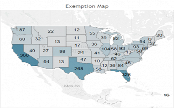 2.来自50个州和波多黎各的商业无人机运营商获得了豁免。来自加州的运营商有360家获得了豁免,紧随其后的是佛罗里达和德克萨斯,分别为328 和268家。
