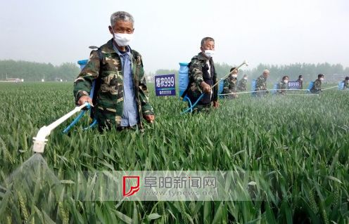 当天的现场会在位于颍泉区中市街道办事处中北村的农业部小麦绿色增产模式攻关示范基地举行。一大早,中北村种粮大户、新世纪农业有限公司负责人丁凯就组织了60多名群众,背着药桶来到麦田边。到了田头,他指导群众将农药配制好,然后指挥大家背起药桶,一字排开,走向麦田深处开展“一喷三防”。“我们目前共承担了农业部小麦绿色增产模式攻关示范项目880亩,由于药物、人员到位,一天时间即可完成‘一喷三防’工作。”丁凯介绍说。