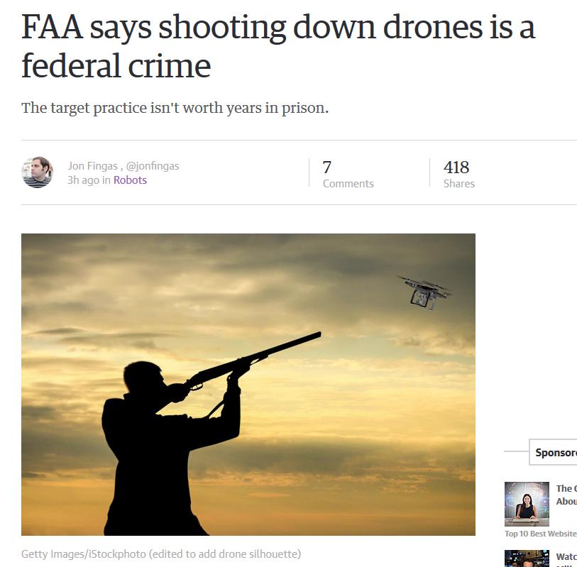 FAA表示,居民无权击落无人机,也不能干扰无人机驾驶员。虽然干扰无人机驾驶员的后果不像干扰民航客机驾驶员那么严重,但仍然属于违法行为。不过,迄今为止还没有美国人因为干扰无人机而被捕。