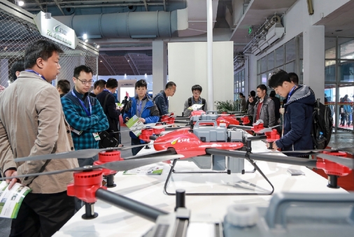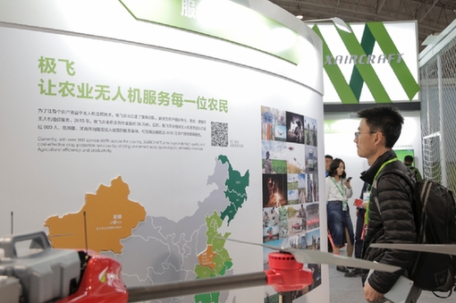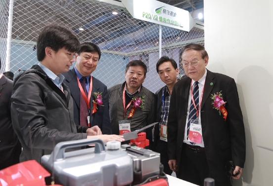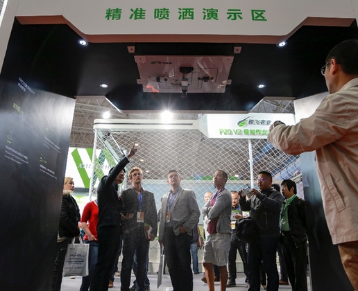 4月18日,极飞农业携最新一代植保无人机系统——P20 V2亮相第七届中国国际现代农业博览会。中国农科院原院长翟虎渠、农业部规划设计研究院院长朱明、中国工程院院士罗锡文、华南农业大学“千人计划”特聘教授兰玉彬一行,在开幕仪式后来到极飞的展台,参观了P20 V2的模拟演示区和喷洒系统。
