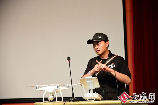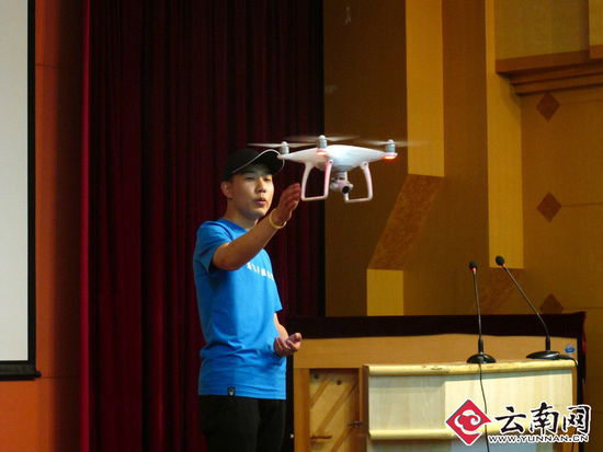 云南网讯4月23日,随着一架无人机轻盈地飞入讲台,云南财经大学现代设计艺术学院“大疆”无人机合作项目暨“大疆新飞手训练营”在云南财经大学锺正山美术馆正式启动,吸引了飞友、摄影爱好者、大学生等110余人到场参加。