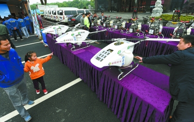 4月24日,观众好奇地观看各式新型农用无人机。当天,“互联网+农业服务”无人机展示活动在长沙举行。各种智能化环保型农用无人机“争奇斗艳”,让观众大开眼界。
