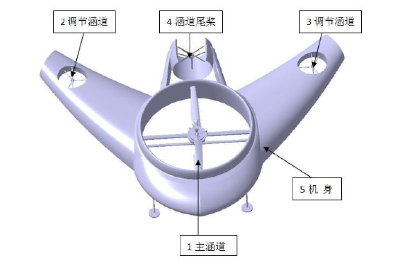 解耦姿态控制方式非常直接:主涵道提供偏航力矩,调节涵道提供横滚力矩,尾桨涵道提供前飞推力,水平涵道共同提供垂向升力。