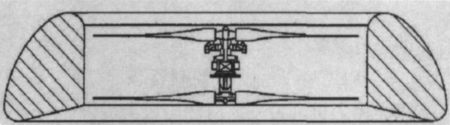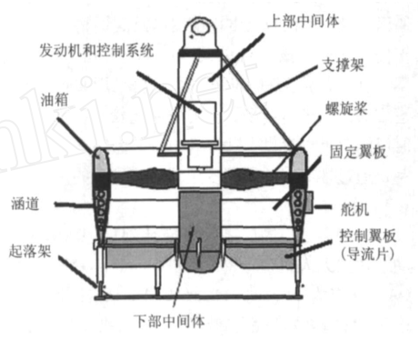 耦合类涵道无人机一般采用环形结构设计,以i-STAR为例,上部中间体中安装动力系统(活塞式发动机,发动机控制器,螺旋桨,有效载荷等)。其中螺旋桨为常见的定距桨,没有变距,没有挥舞,直接由发动机驱动。下部中间体由8块固定翼板稳定于涵道中央,内部搭载反馈系统。这个8个固定翼板(固定片)安置角不变,产生平衡单旋翼扭矩的效果。控制翼板(导流片)由伺服电机控制角度产生姿态控制力矩。