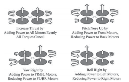 对于有些机型如直升机型、多旋翼类型除了姿态控制外也涉及反扭矩的提供,而且提供反扭矩的方式在上述两种机型中都非常明显了:直升机通过尾桨总距控制提供机体坐标系偏航方向上的反扭矩,多旋翼无人机通过相同数目不同转向定距桨提供反扭矩平衡。