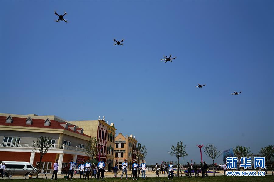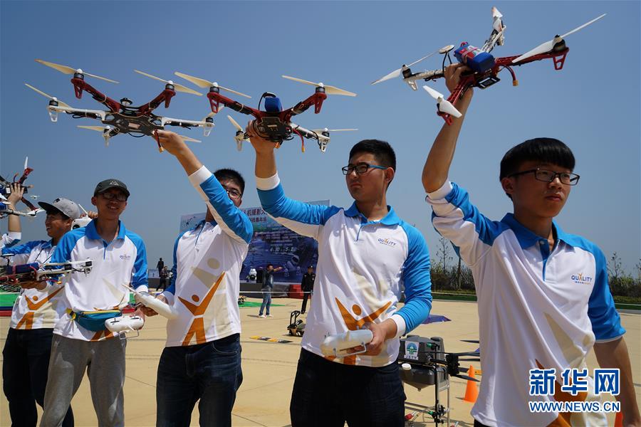 4月30日,参赛队员在开幕式上试飞无人机。当日,江苏省首届无人机摄影大赛在盐城市大丰港开赛,来自全省19个无人机飞行团队的8种机型参加此次大赛。 新华社记者韩瑜庆摄