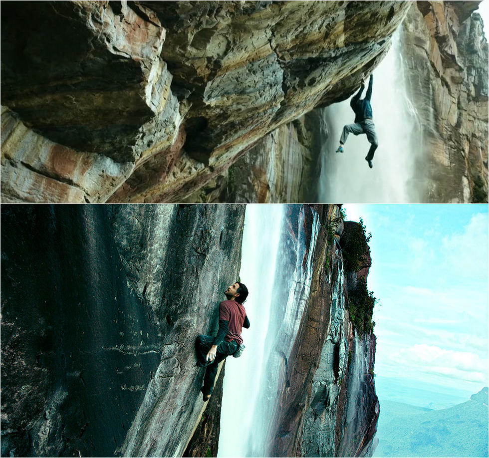天使瀑布不仅是世界闻名的风景名胜,在电影中“出镜率”也相当之高。在2015年上映的电影《极盗者》中,主创们就以身试险,徒手攀登天使瀑布岩壁。图为电影剧照。