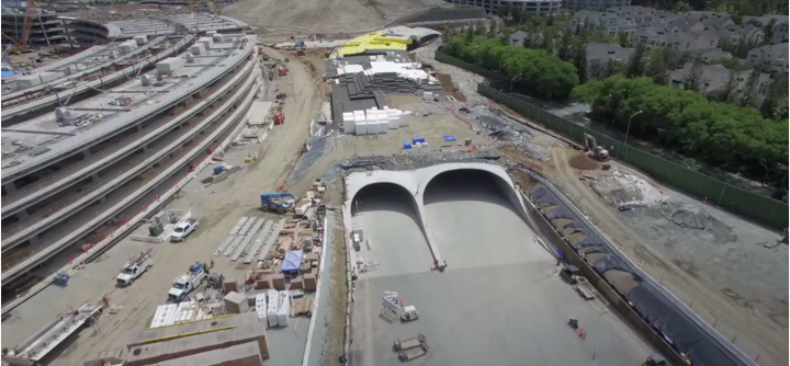 从无人机航拍图中我们可以看到,这座耗资50亿美元的Campus 2已逐渐成形。连接整个园区的隧道、桥梁和坡道正在建设中。