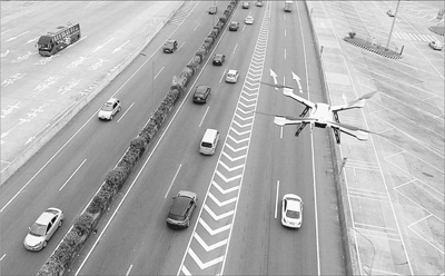 今年“五一”小长假期间,广州交警首次使用无人机巡逻,重点针对车辆违法占用应急车道行为进行抓拍。图为5月2日,警用无人机在高速公路上方巡逻。