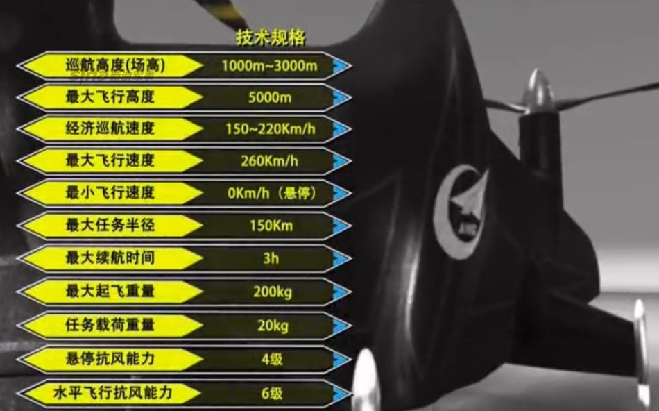 随后播放的一段展示视频展示了这架无人机的基本数据(这段视频在2015年的北京国际航展上曾经公开):翼展4.6米,全长1.8米,起飞重量200公斤,载荷20公斤。VD200无人机最大飞行速度260公里/小时,航程150公里,留空时间3小时。