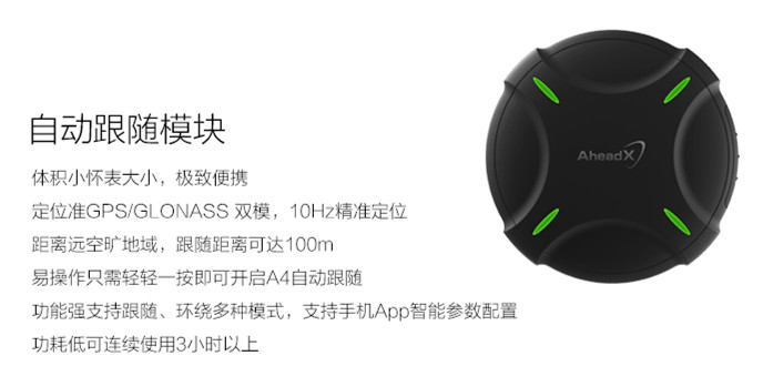 致导A4无人机主打折叠、并没有宣传自动跟踪功能。但是其配置表里也有自动跟随模块。只不过这个模块不止有GPS,还支持格洛纳斯定位。