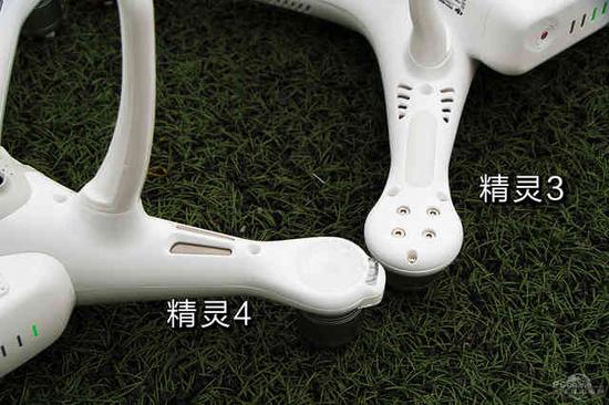 位于电池底部的新电池接口(左为精灵3电池,右为精灵4电池)