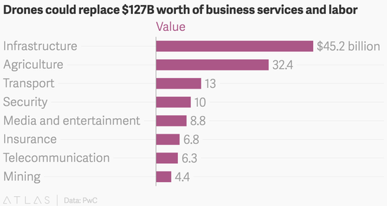 普华永道认为,包括能源、铁路、石油和天然气等在内的基础设施领域将是从无人机技术发展中获益最大的。在这一领域当中,他们估计无人机将取代价值452亿美元的服务和劳动。