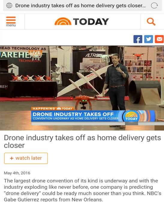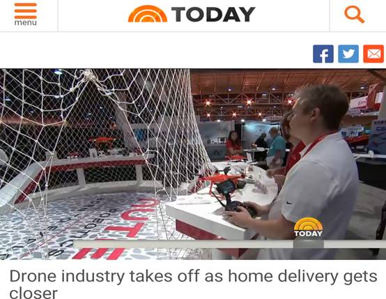 其中,全美三大商业广播电视公司之一的美国全国广播公司NBC(National Broadcasting Company)“TODAY”栏目记者,在道通无人机展台前悬停道通的无人机,并现场播报节目称:无人机行业发展比人们预想得要快,目前已经腾飞。不久的将来,无人机更多的用途将会被发掘出来。