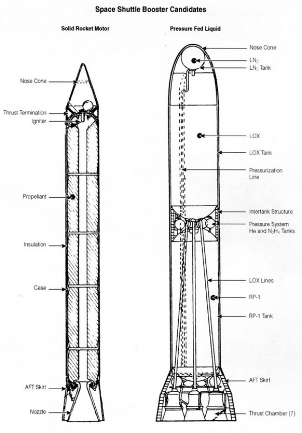 航天飞机研制初期绘制的固体和液体燃料助推器对比图,可见,固体助推器在推力相当的情况下,更小更轻