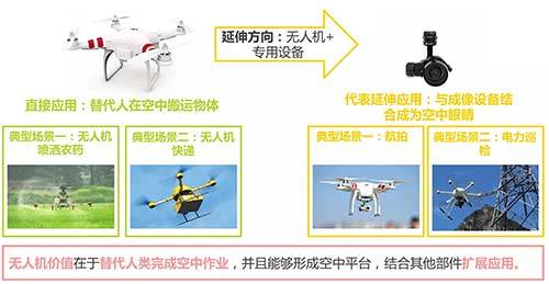 无人机即空中机器人,能够替代人类完成空中作业,同时与成像设备等部件结合能够扩展应用场景,实现无人机+。